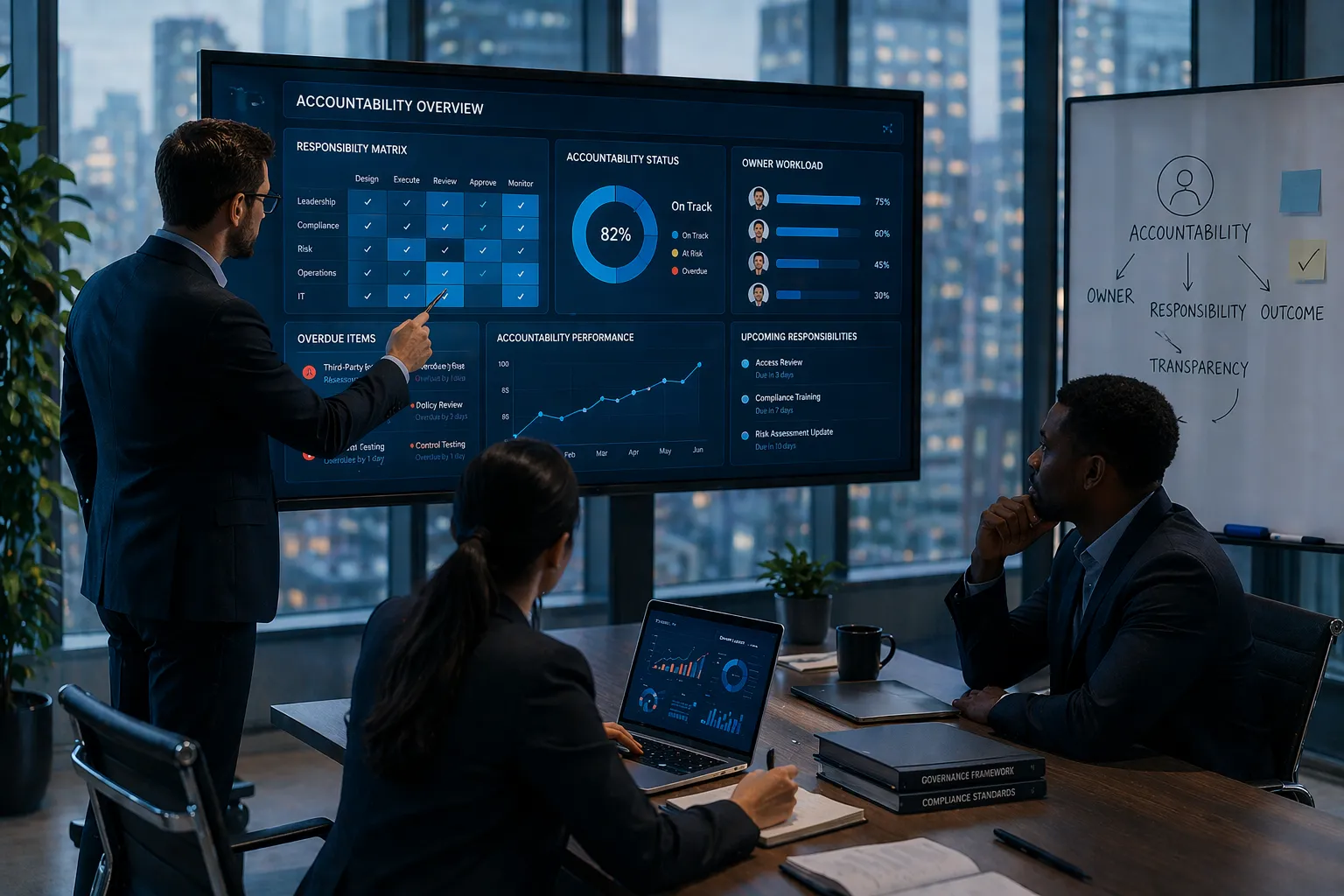 تدمج هذه العملية مسؤوليات الحوكمة ضمن الأدوار التنظيمية بدلاً من التعامل معها كمتطلبات خارجية. من خلال مواءمة المساءلة مع التسلسل التشغيلي، تعزز المؤسسات انضباط التنفيذ وتقلل من مخاطر الثغرات في الامتثال.