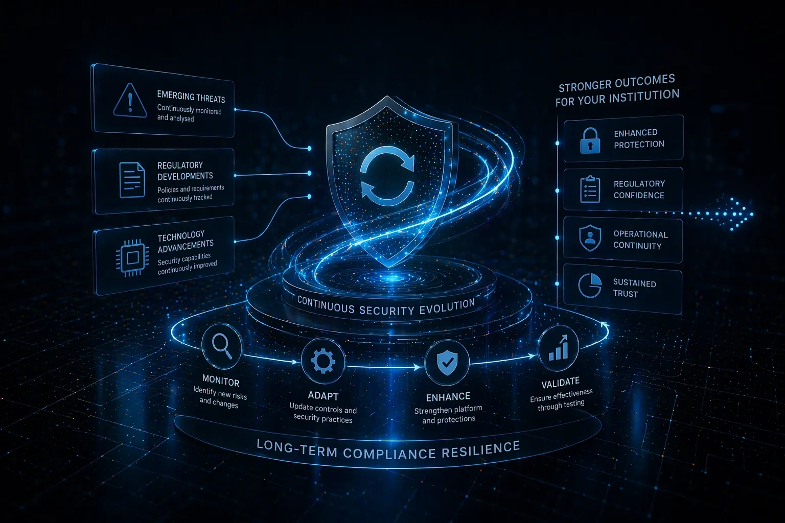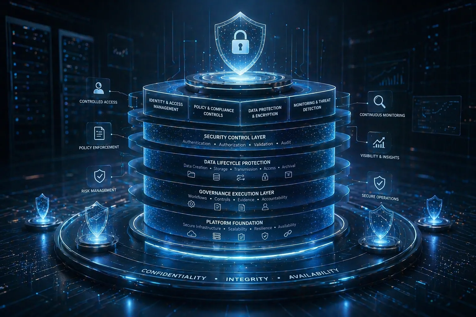 Security controls are embedded within system design, ensuring that compliance execution workflows operate within a controlled environment aligned with organisational risk management policies. This architecture supports secure operational continuity while enabling institutions to maintain visibility into governance processes without compromising data integrity.